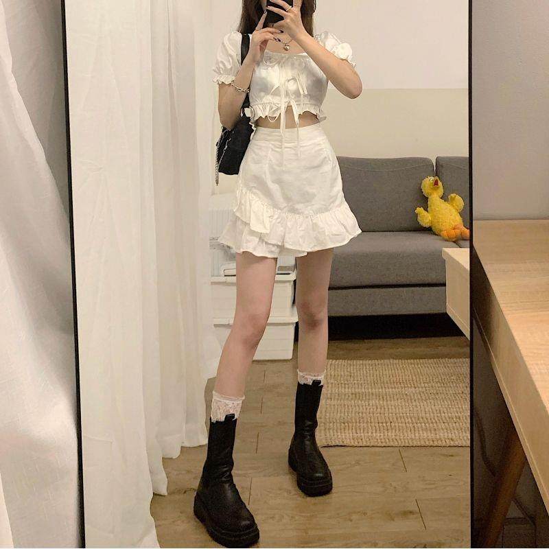 2021夏季新款韩版小众设计感短款绑带上衣+荷叶边半身裙热门设计联盟服务商